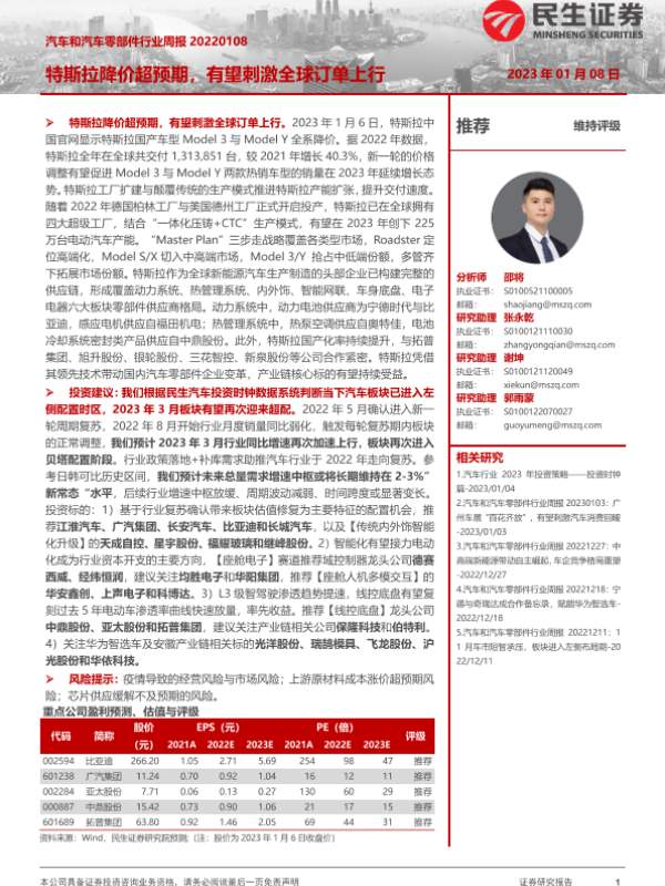 【民生证券】【20230108】汽车和汽车零部件行业周报:特斯拉降价超预期,有望刺激全球订单上行-22页