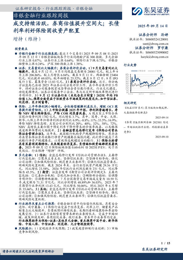 【东吴证券】【202509】成交持续活跃,券商估值提升空间大;长债利率利好保险固收资产配置-15页