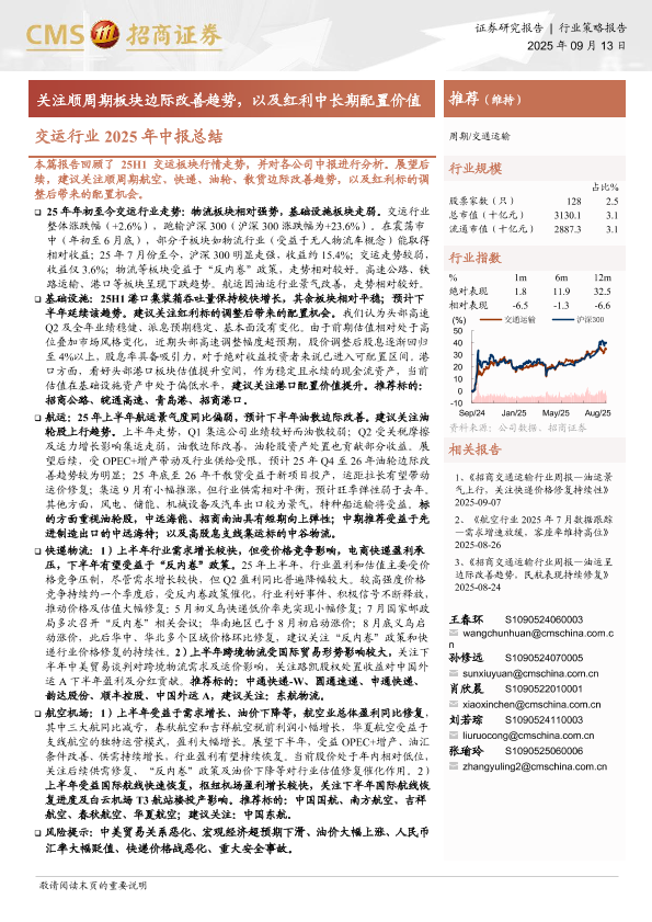 【海通证券】【202509】交运行业2025年中报总结:关注顺周期板块边际改善趋势,以及红利中长期配置价值-14页