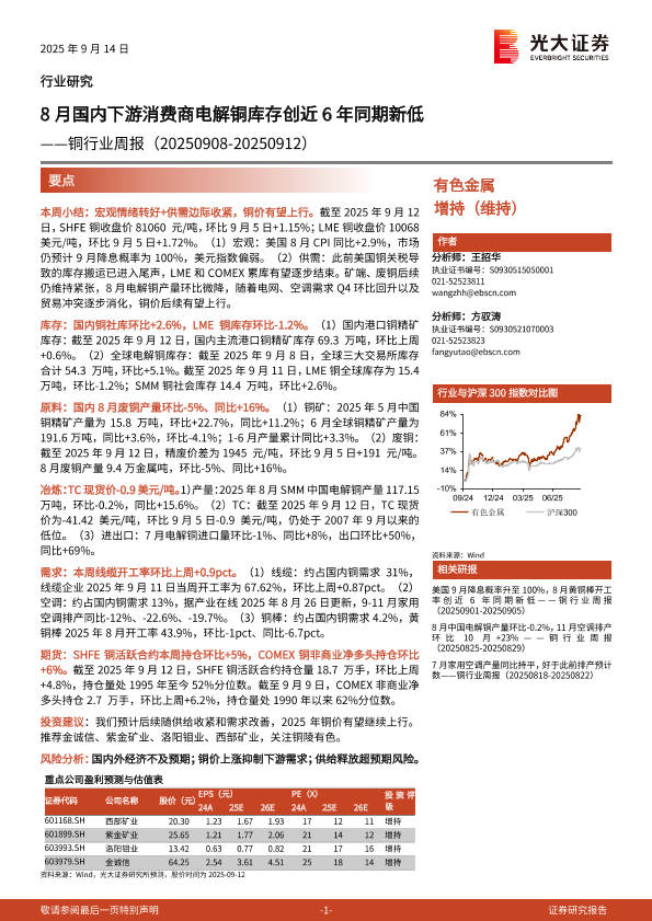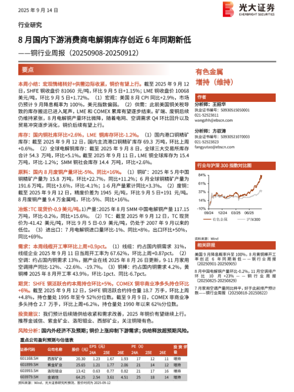 【光大证券】【202509】8月国内下游消费商电解铜库存创近6年同期新低——铜行业周报(20250908-20250912)-18页