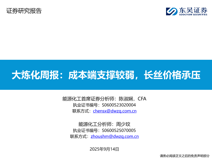 【东吴证券】【202509】大炼化周报:成本端支撑较弱,长丝价格承压-34页