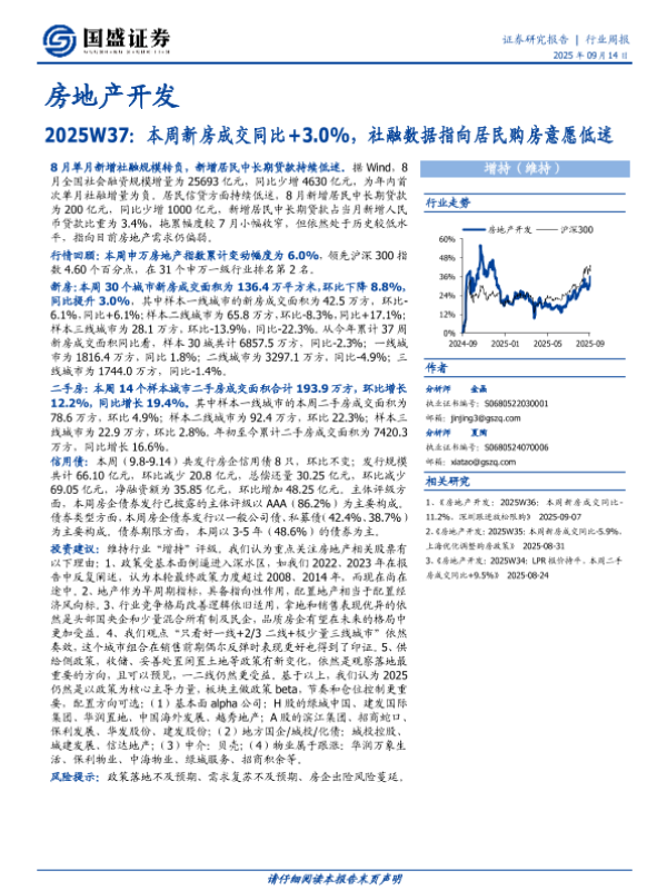 【国盛证券】【202509】2025W37:本周新房成交同比+3.0%,社融数据指向居民购房意愿低迷-15页
