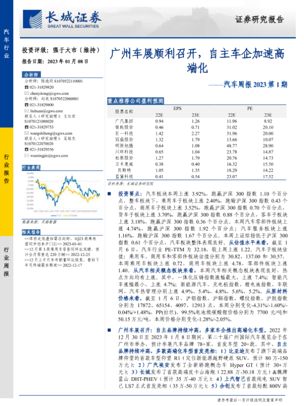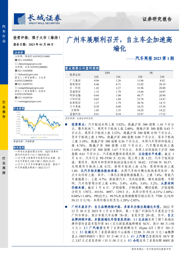 【长城证券】【20230108】汽车行业周报2023第1期:广州车展顺利召开,自主车企加速高端化-22页