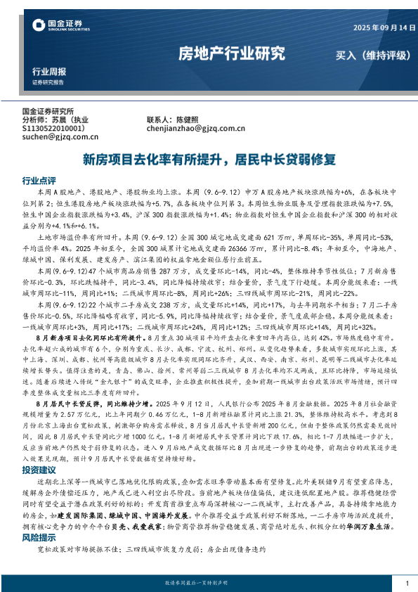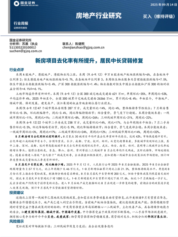 【国金证券】【202509】20250914-国金证券-房地产行业研究:新房项目去化率有所提升,居民中长贷弱修复-19页