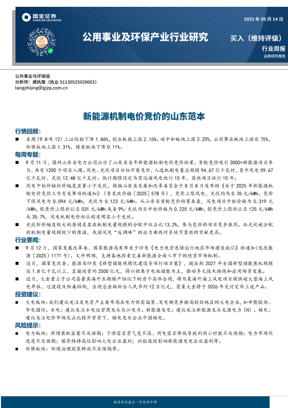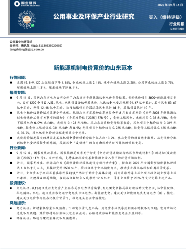 【国金证券】【202509】20250914-国金证券-公用事业及环保产业行业研究:新能源机制电价竞价的山东范本.pdf-16页