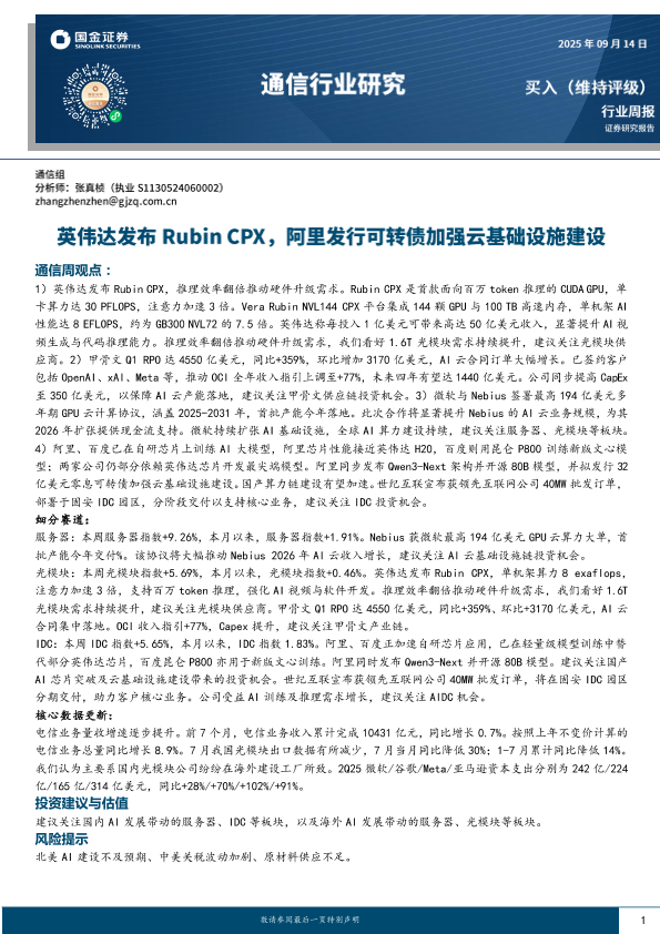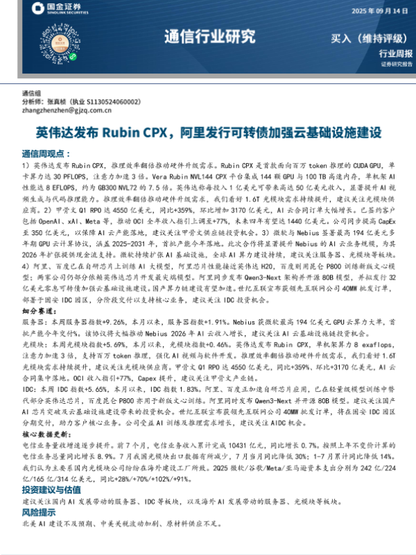 【国金证券】【202509】20250914-国金证券-通信行业研究:英伟达发布Rubin CPX,阿里发行可转债加强云基础设施建设.pdf-11页