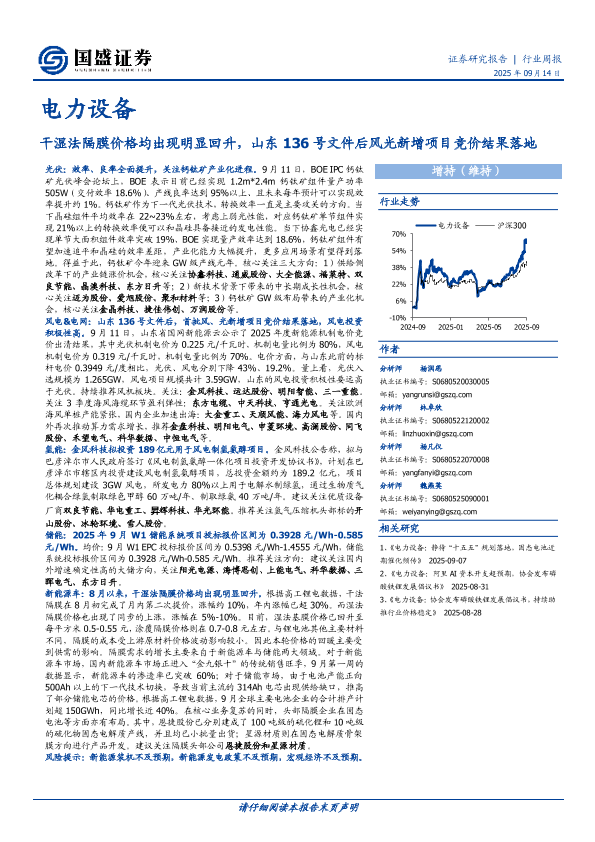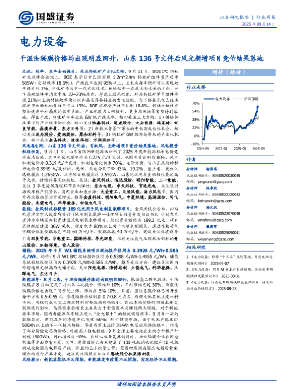 【国盛证券】【202509】电力设备行业周报:干湿法隔膜价格均出现明显回升,山东136号文件后风光新增项目竞价结果落地-14页