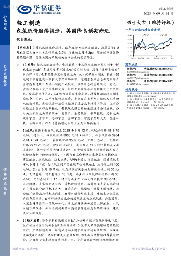 出口链企业 美国降息预期 包装纸价上涨 家居行业复苏 造纸行业分析