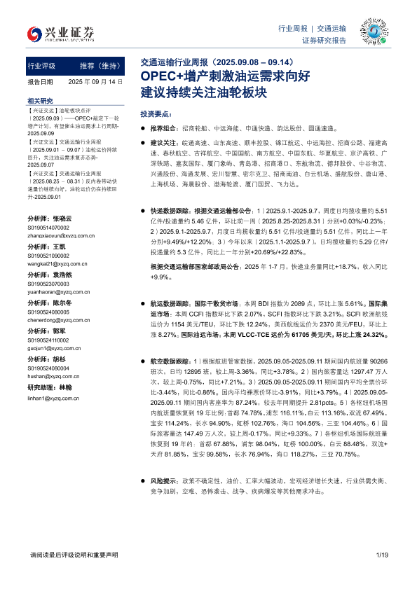 【兴业证券】【202509】交通运输行业周报:OPEC+增产刺激油运需求向好 建议持续关注油轮板块-19页