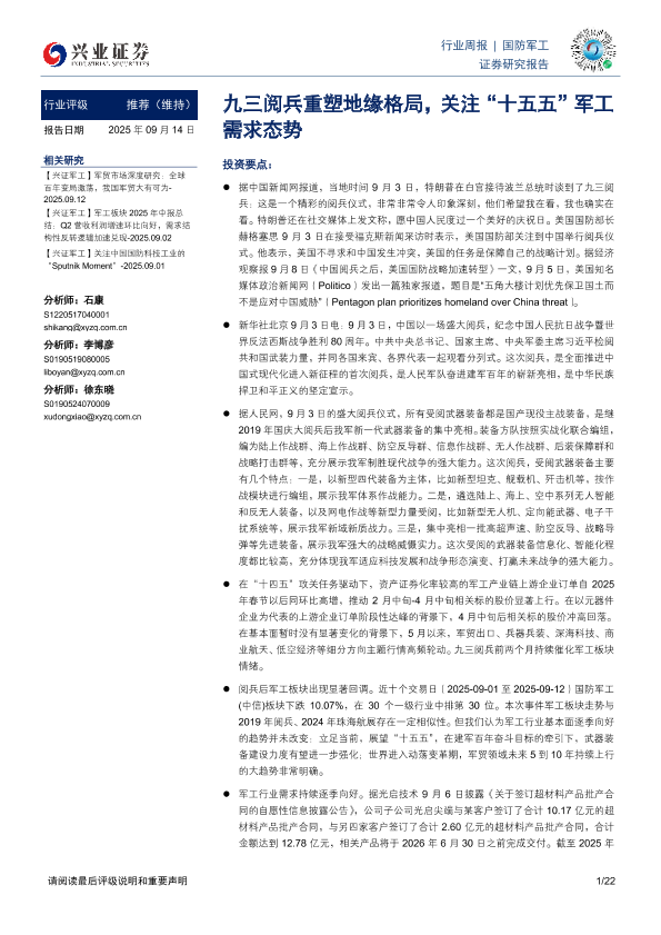 【兴业证券】【202509】国防军工行业周报:九三阅兵重塑地缘格局,关注“十五五”军工需求态势-22页