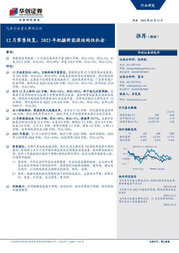 【华创证券】【20230111】汽车行业重大事项点评:12月零售恢复,2023年把握新能源结构性机会-16页