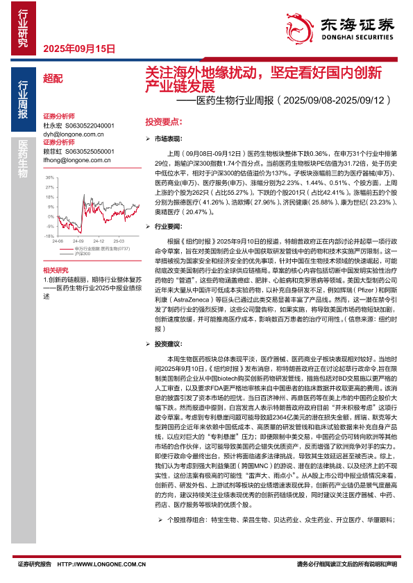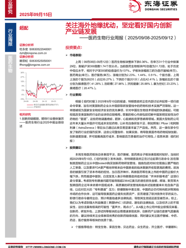 创新药 投资建议 行业周报 地缘政治 医药生物