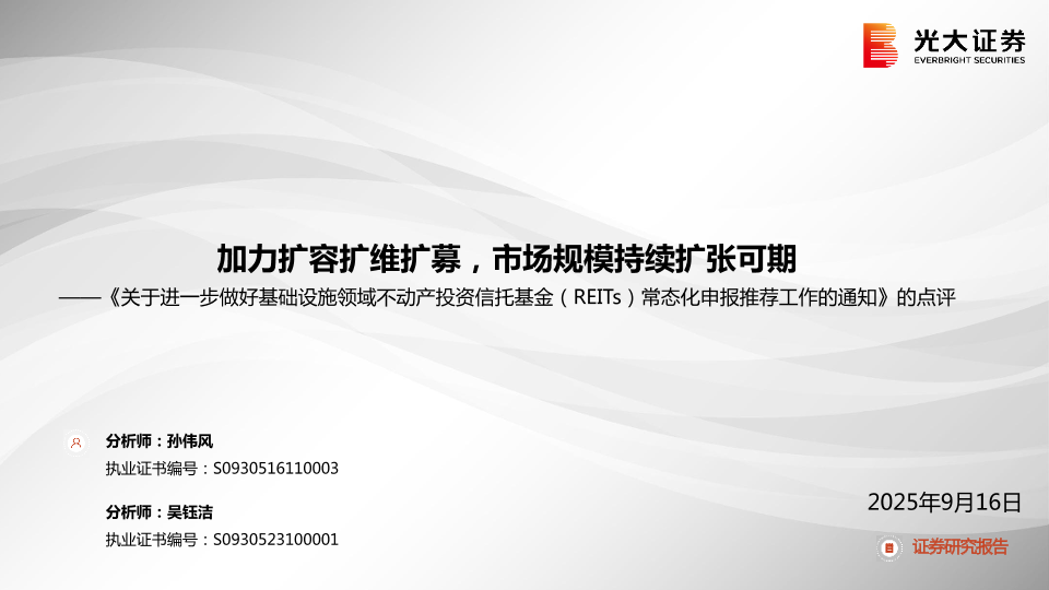 【光大证券】【202509】加力扩容扩维扩募,市场规模持续扩张可期——《关于进一步做好基础设施领域不动产投资信托基金(REITs)常态化申报推荐工作的通知》的点评-11页