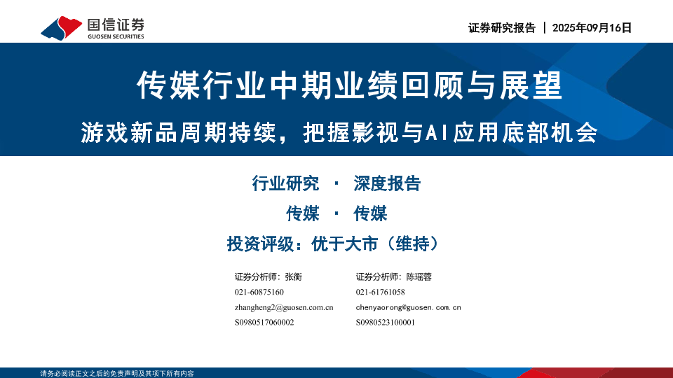 【国信证券】【202509】传媒行业中期业绩回顾与展望:游戏新品周期持续,把握影视与AI应用底部机会-48页