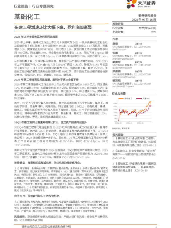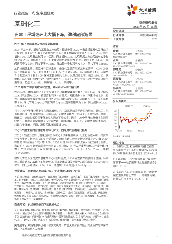 【天风证券】【202509】基础化工行业专题研究:在建工程增速环比大幅下降,盈利底部渐显-23页