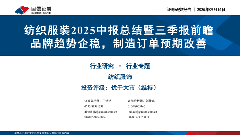 【国信证券】【202509】纺织服装2025中报总结暨三季报前瞻:品牌趋势企稳,制造订单预期改善-66页