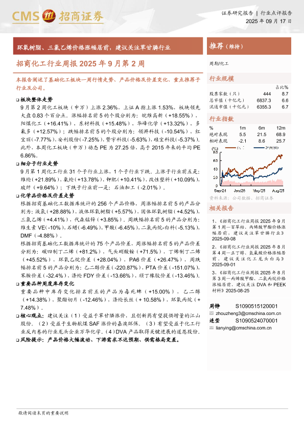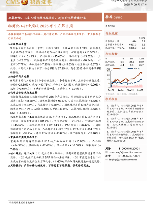 【海通证券】【202509】招商化工行业周报2025年9月第2周:环氧树脂、三氯乙烯价格涨幅居前,建议关注草甘膦行业-16页