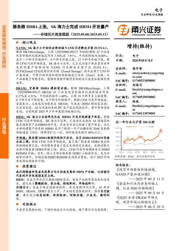 【甬兴证券】【202509】服务器 DDR4上涨,SK海力士完成 HBM4开发量产——存储芯片周度跟踪(2025.09.08-2025.09.12)-10页
