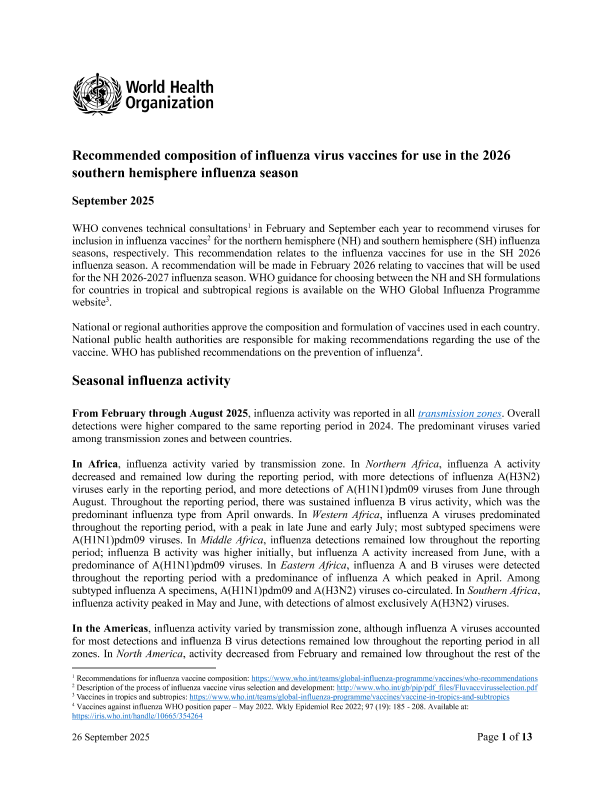 【世界卫生组织】【202509】Recommended composition of influenza virus vaccines for use in the 2026 southern hemisphere influenza season-13页