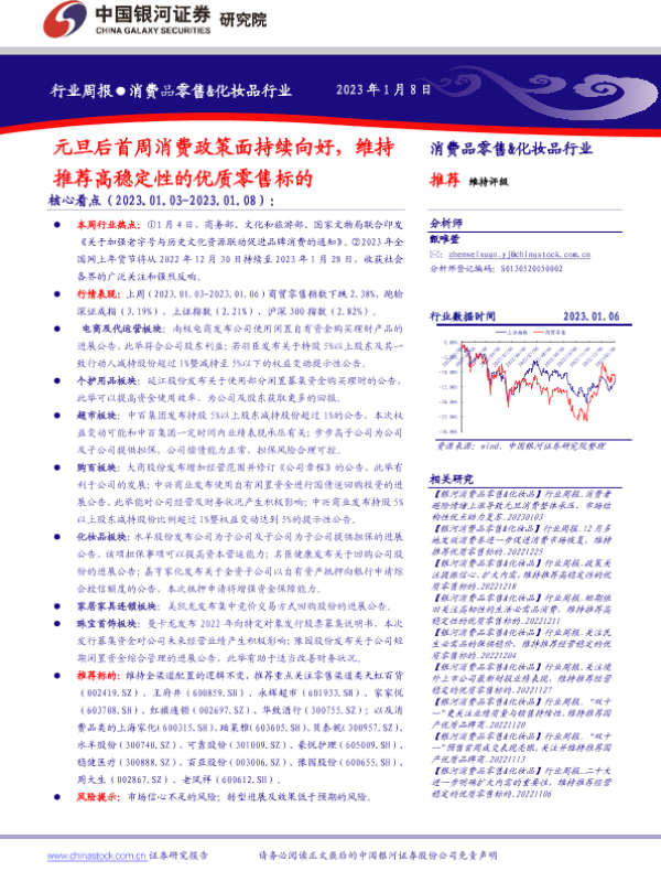 【银河证券】【20230108】消费品零售&化妆品行业周报:元旦后首周消费政策面持续向好,维持推荐高稳定性的优质零售标的-32页