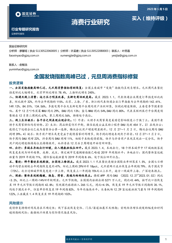 【国金证券】【20230105】消费行业专题研究报告:全国发烧指数高峰已过,元旦周消费指标修复-17页