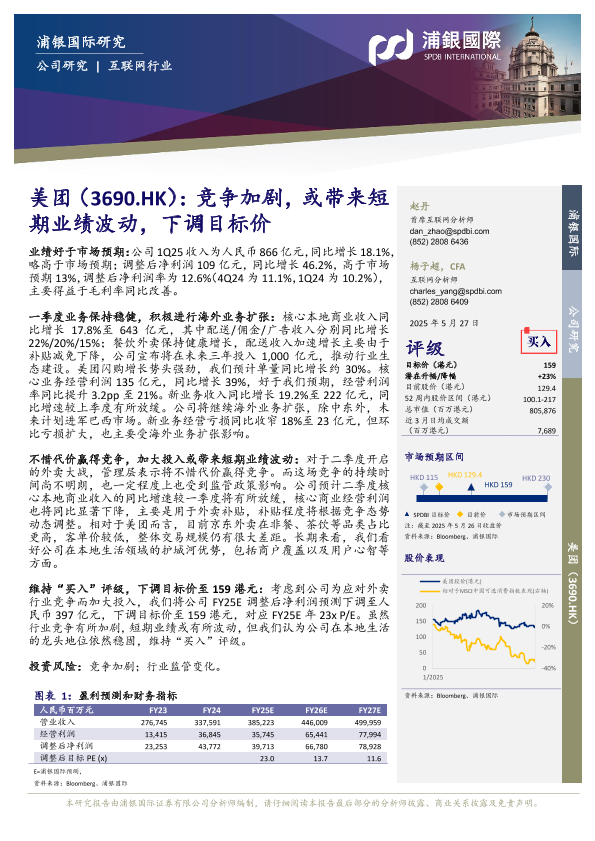 【浦银国际】【202505】美团(3690.HK):竞争加剧,或带来短期业绩波动,下调目标价-7页