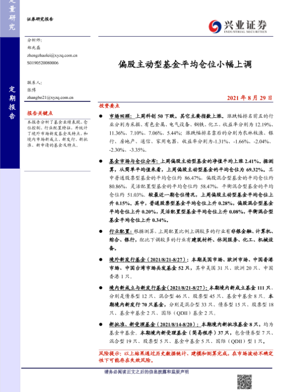【兴业证券】【20210829】偏股主动型基金平均仓位小幅上调-16页