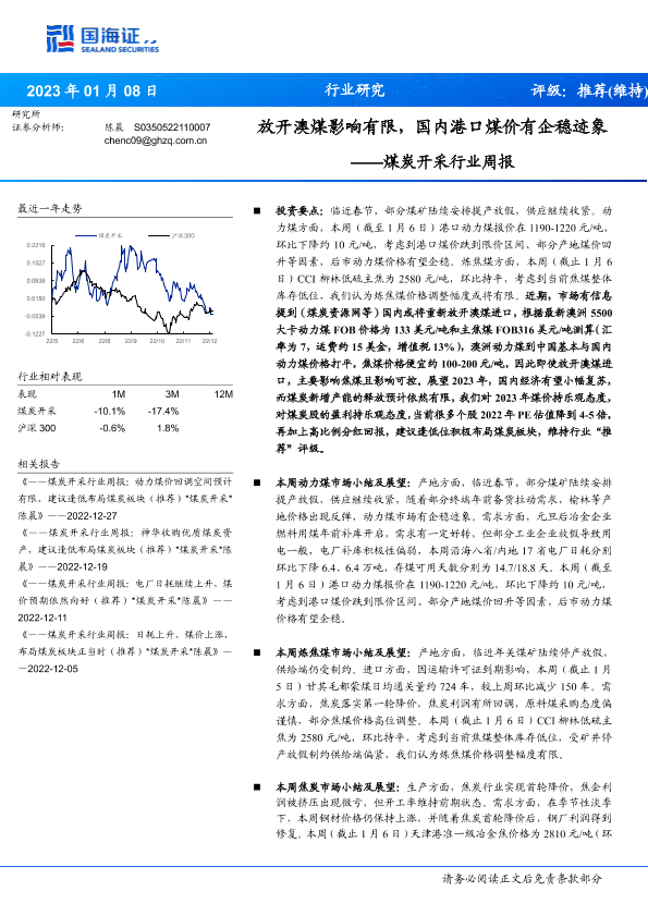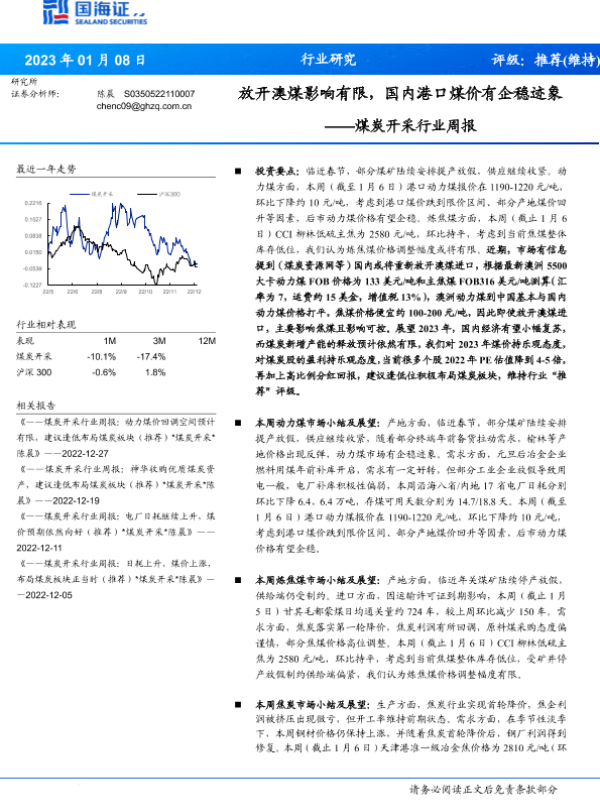 【国海证券】【20230108】煤炭开采行业周报:放开澳煤影响有限,国内港口煤价有企稳迹象-18页