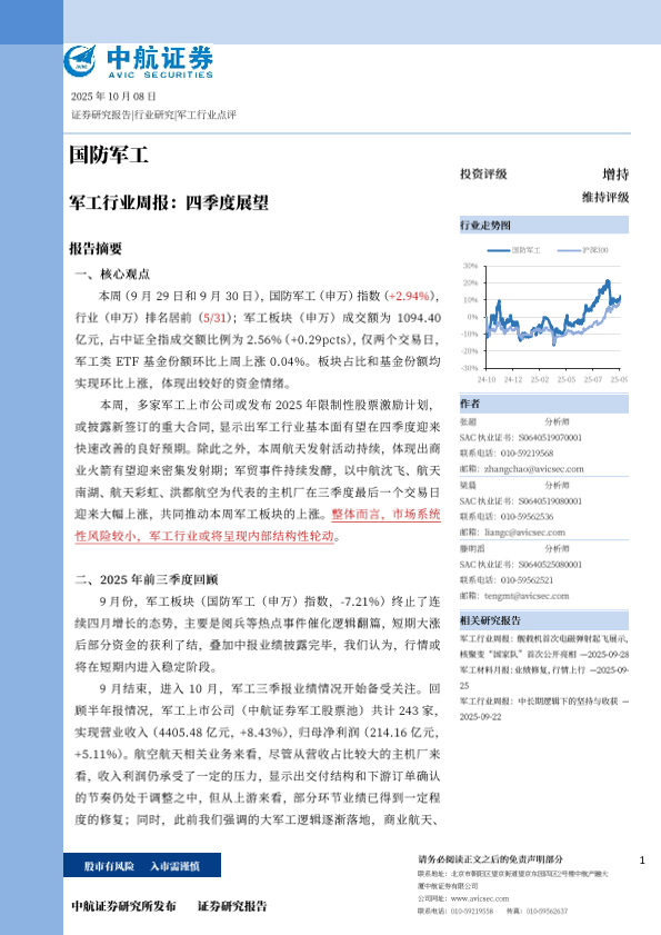 投资评级 军工行业 中航证券 行业研究 四季度展望