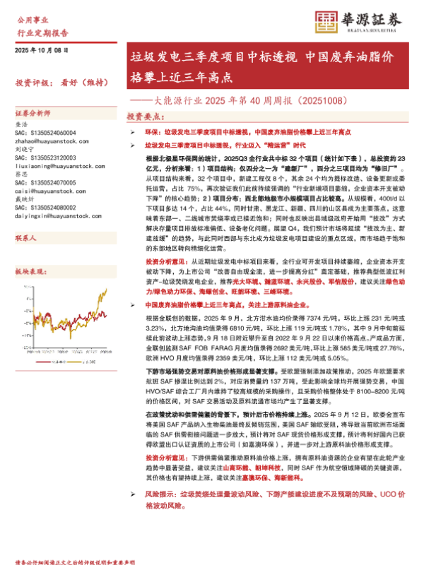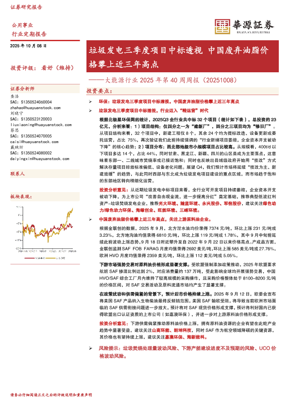 投资评级 垃圾发电 废弃油脂价格 技改项目 环保行业