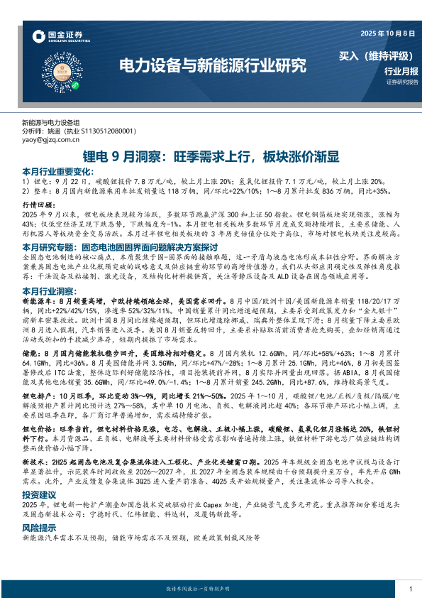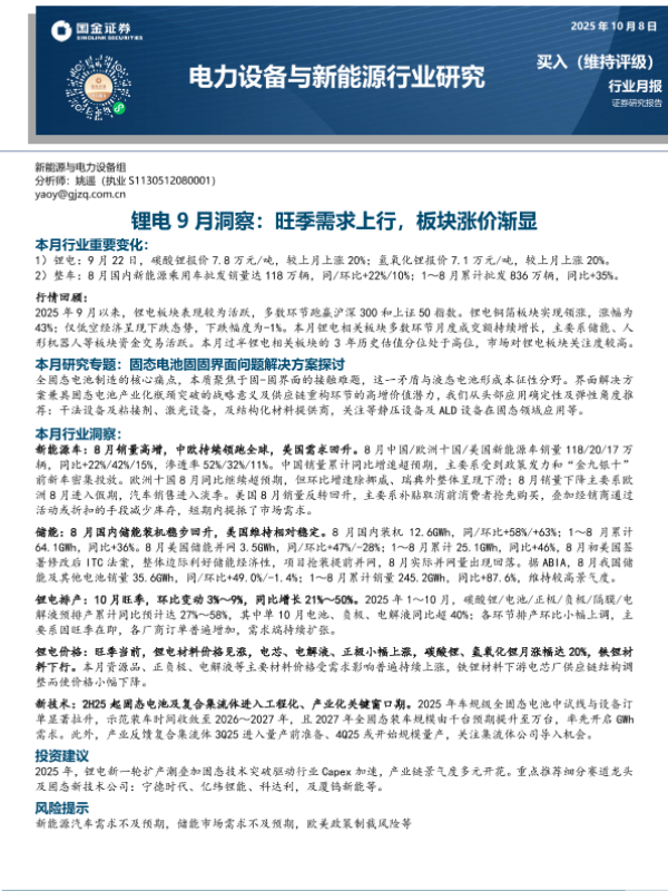 【国金证券】【202510】锂电9月洞察:旺季需求上行,板块涨价渐显-14页