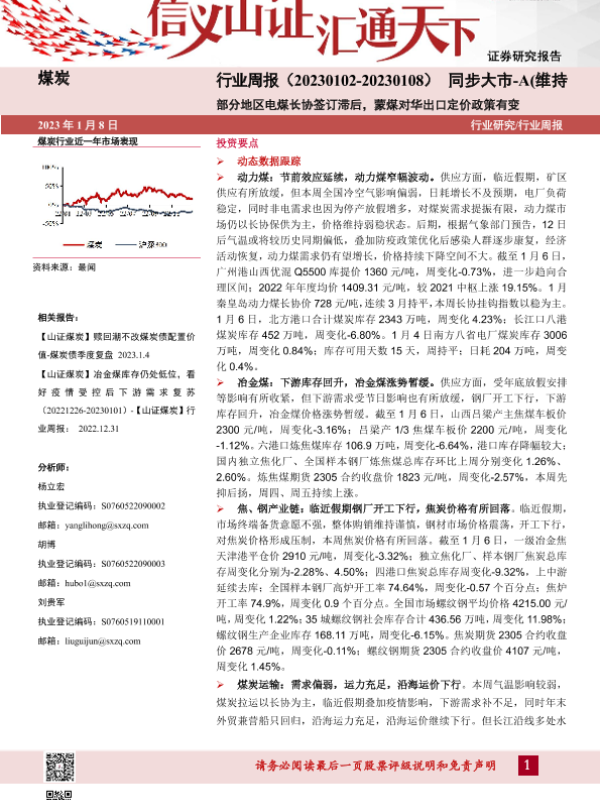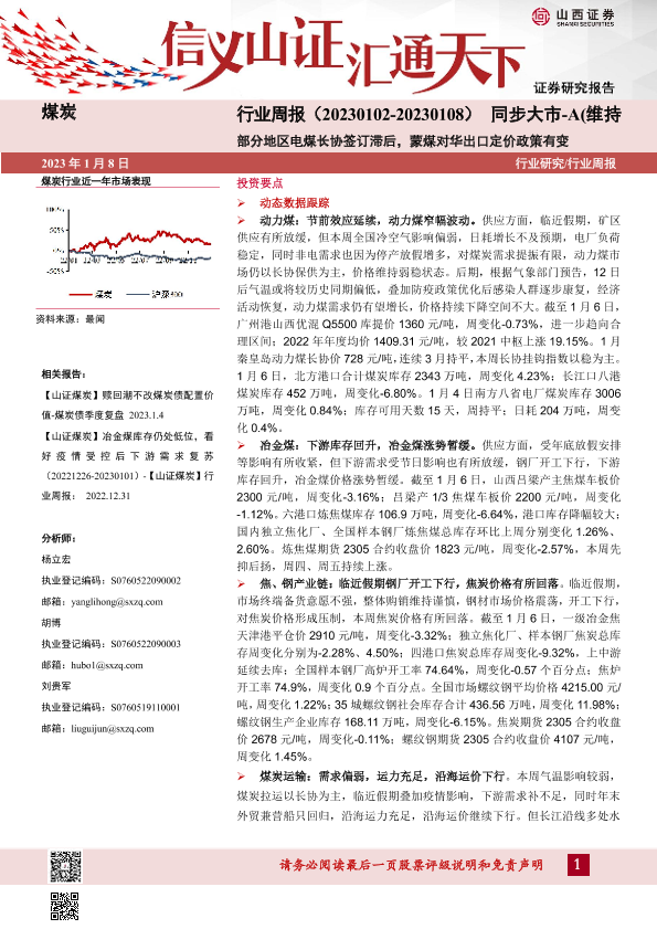 【山西证券】【20230108】煤炭行业周报:部分地区电煤长协签订滞后,蒙煤对华出口定价政策有变-20页