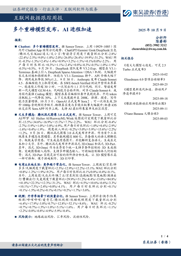 【东吴证券(香港)】【202510】多个重磅模型发布,AI进程加速-4页