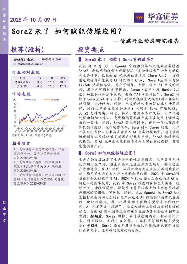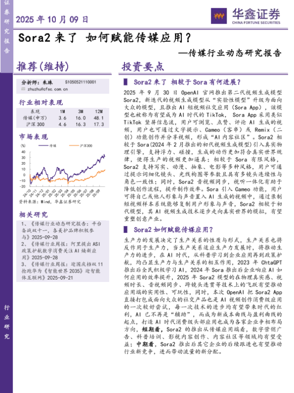 【华鑫证券】【202510】Sora2来了如何赋能传媒应用?—传媒行业动态研究报告-5页