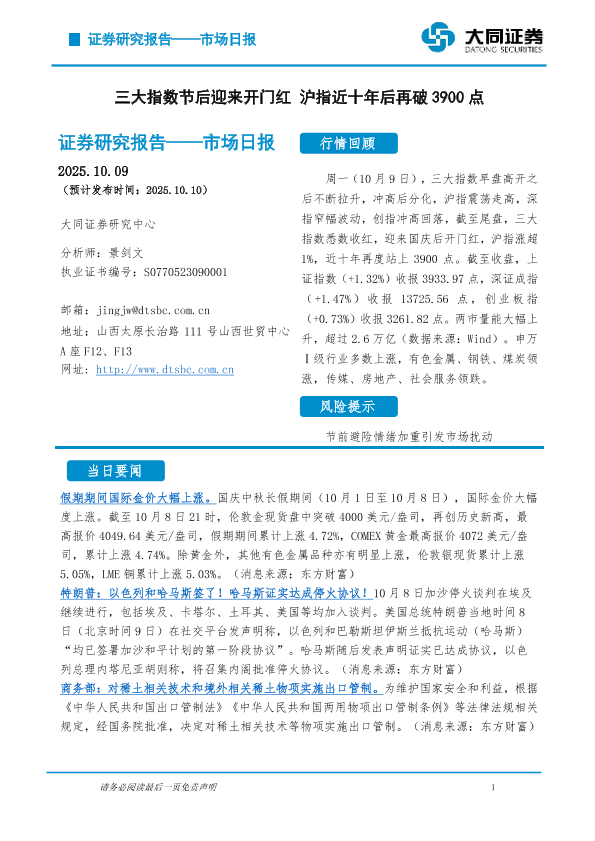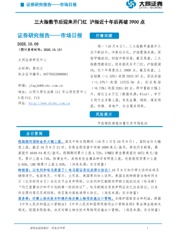 【大同证券研究中心】【202510】三大指数节后迎来开门红沪指近十年后再破3900点-5页