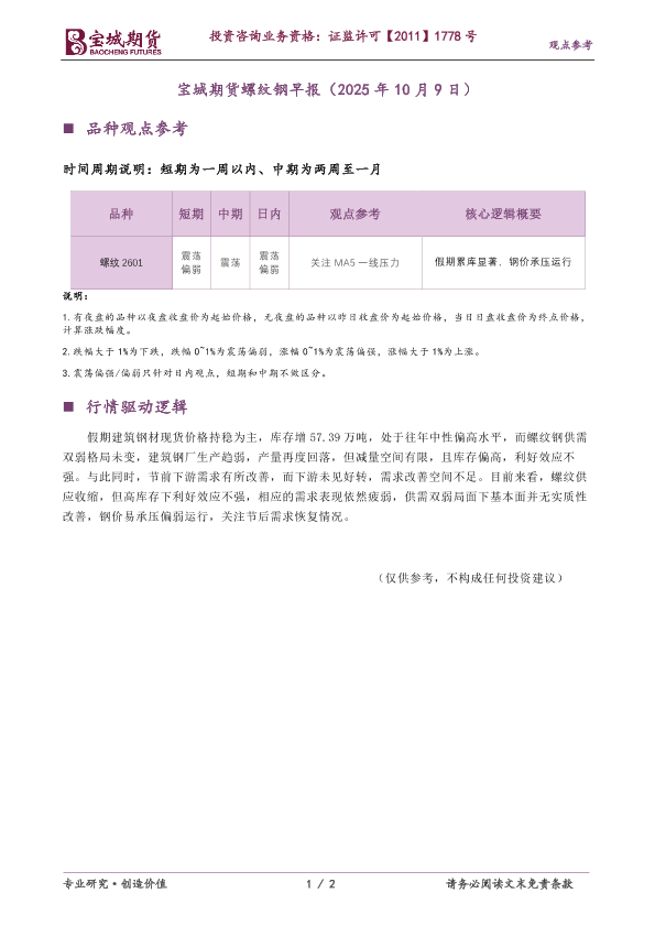 【宝城期货】【202510】宝城期货螺纹钢早报(2025年 10月 9日)-2页