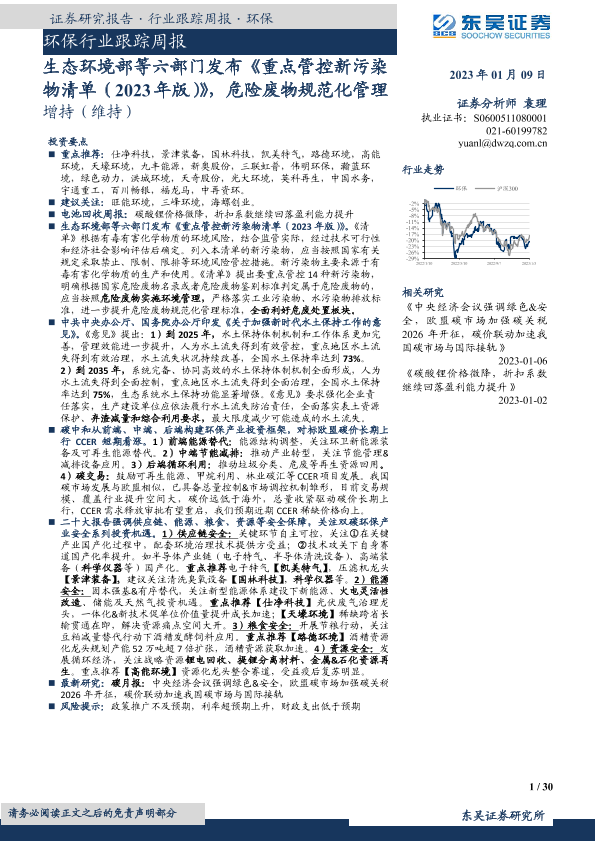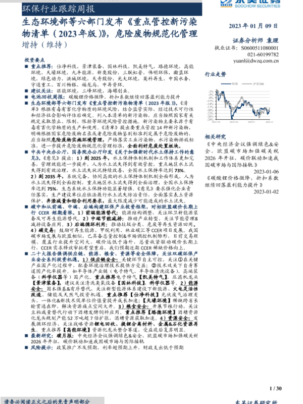 【东吴证券】【20230109】环保行业跟踪周报:生态环境部等六部门发布《重点管控新污染物清单(2023年版)》,危险废物规范化管理-30页