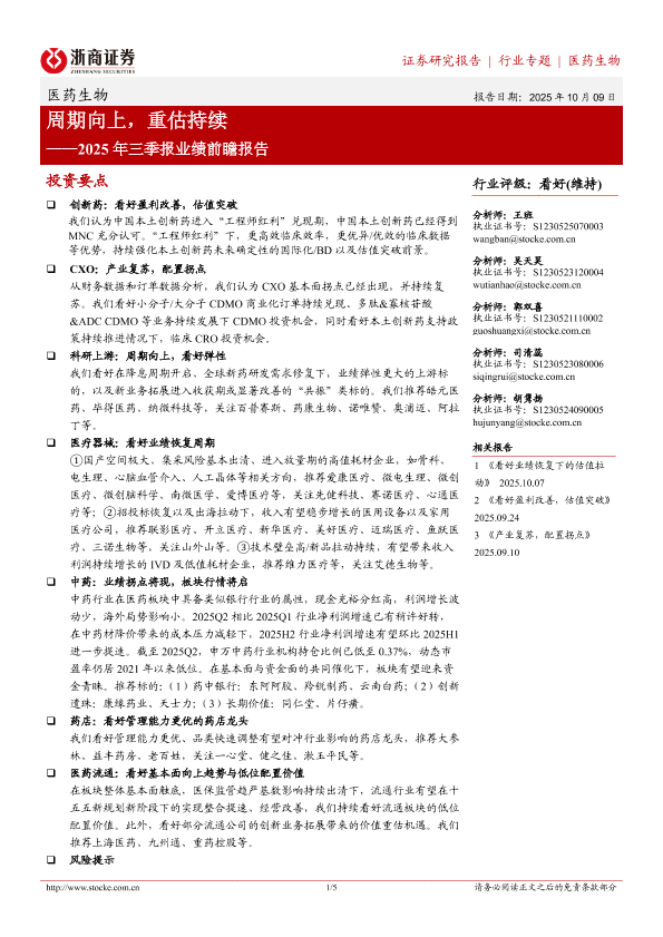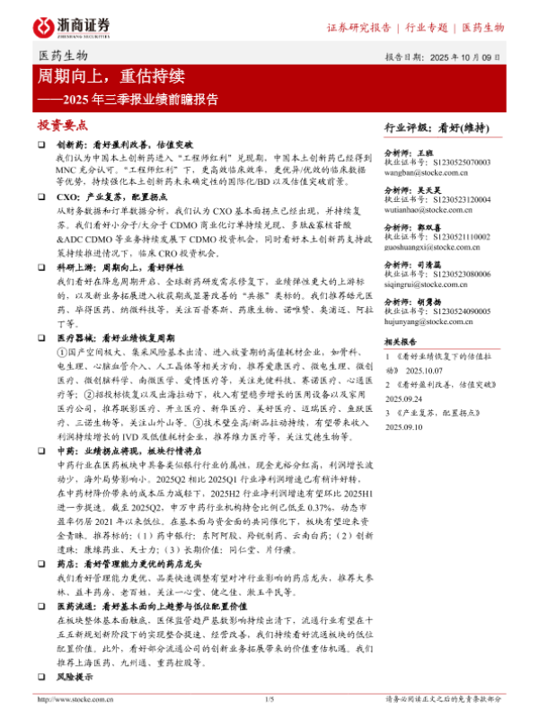 投资评级 周期复苏 业绩预测 行业前瞻 医药生物