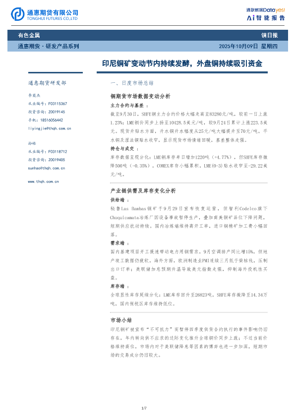 【通惠期货研发部】【202309】印尼铜矿变动节内持续发酵,外盘铜持续吸引资金-7页