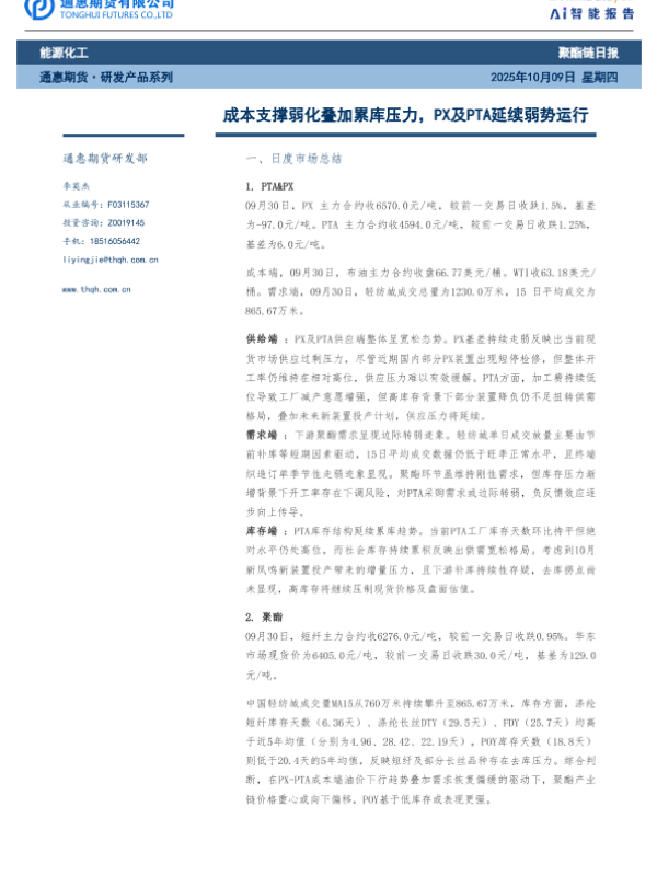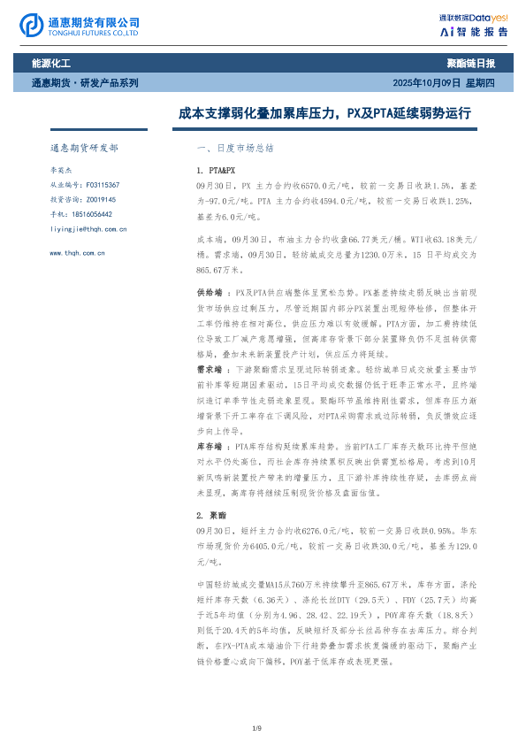 【通惠期货研发部】【202309】成本支撑弱化叠加累库压力,PX及PTA延续弱势运行-9页