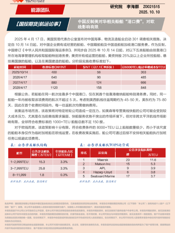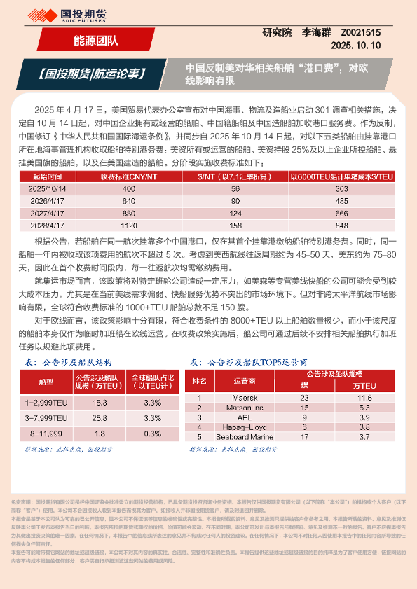 【国投期货】【202510】中国反制美对华相关船舶“港口费”,对欧线影响有限-1页