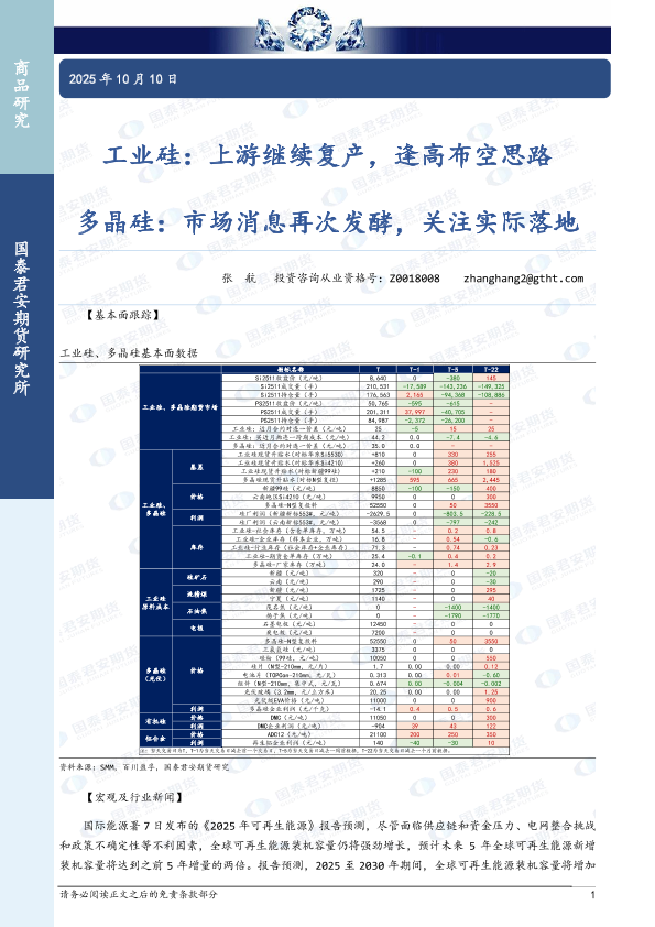 【国泰君安期货】【202510】工业硅:上游继续复产,逢高布空思路 多晶硅:市场消息再次发酵,关注实际落地-3页