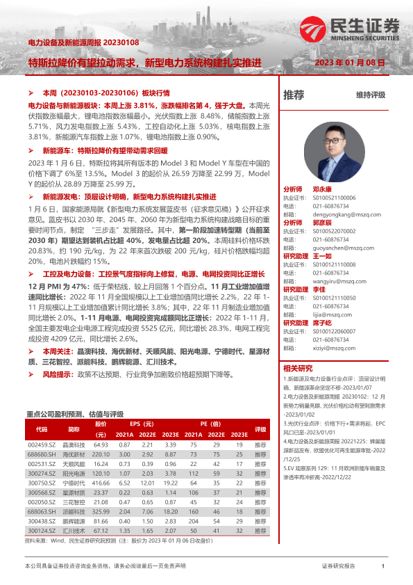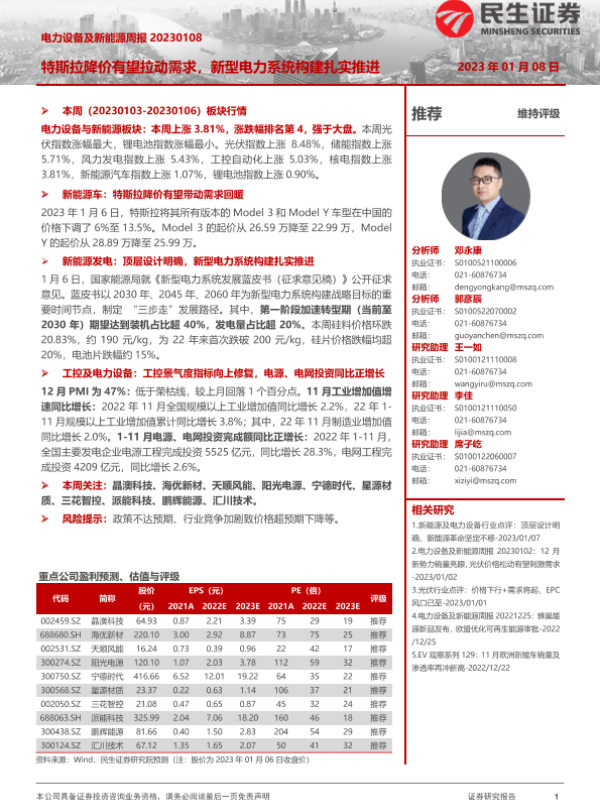 【民生证券】【20230108】电力设备及新能源周报:特斯拉降价有望拉动需求,新型电力系统构建扎实推进-25页