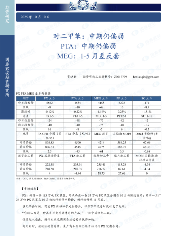 【国泰君安期货】【202510】对二甲苯_中期仍偏弱_PTA_中期仍偏弱_MEG_1-5月差反套-4页