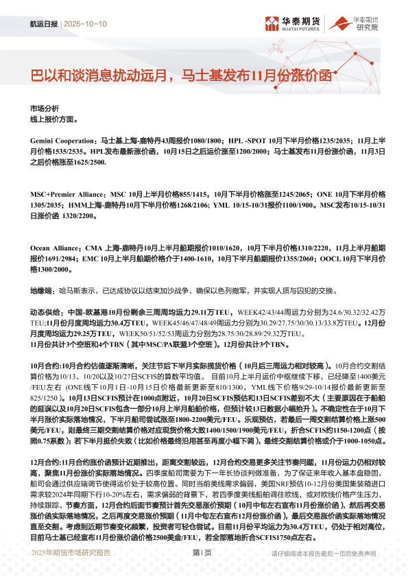 【华泰期货】【202510】航运日报_巴以和谈消息扰动远月_马士基发布11月份涨价函-14页