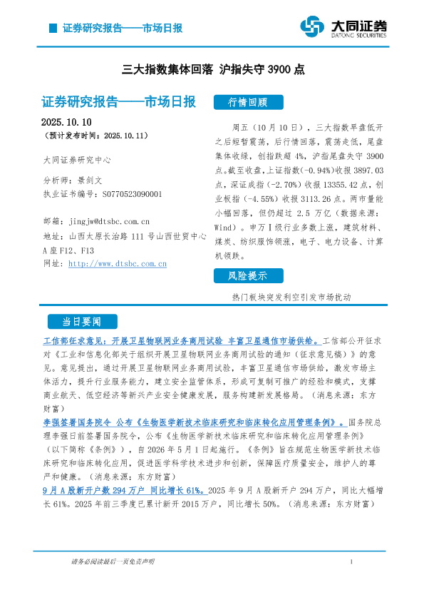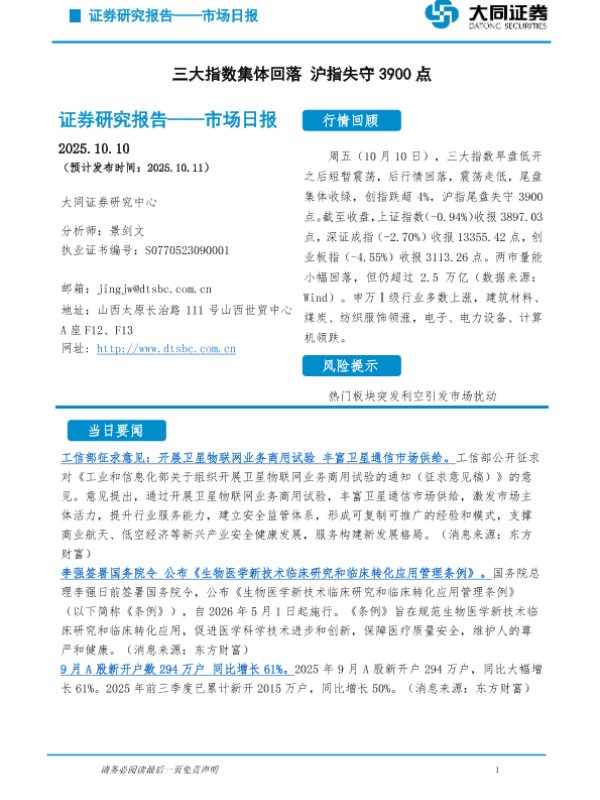 【大同证券研究中心】【202510】市场日报_三大指数集体回落_沪指失守3900点-5页