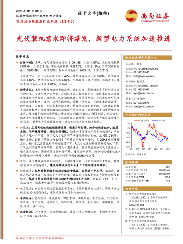 【西南证券】【20230108】电力设备新能源行业周报:光伏装机需求即将爆发,新型电力系统加速推进-34页