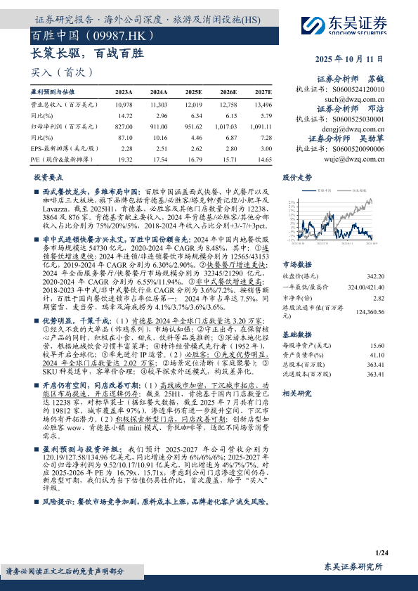 投资评级 门店扩张 西式快餐 百胜中国 餐饮连锁