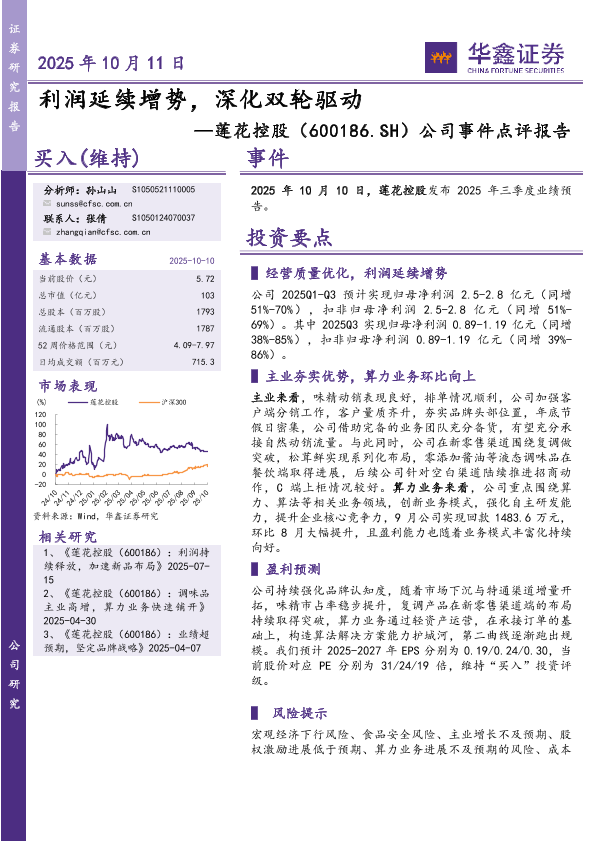 算力业务 调味品 业绩预告 莲花控股 盈利预测