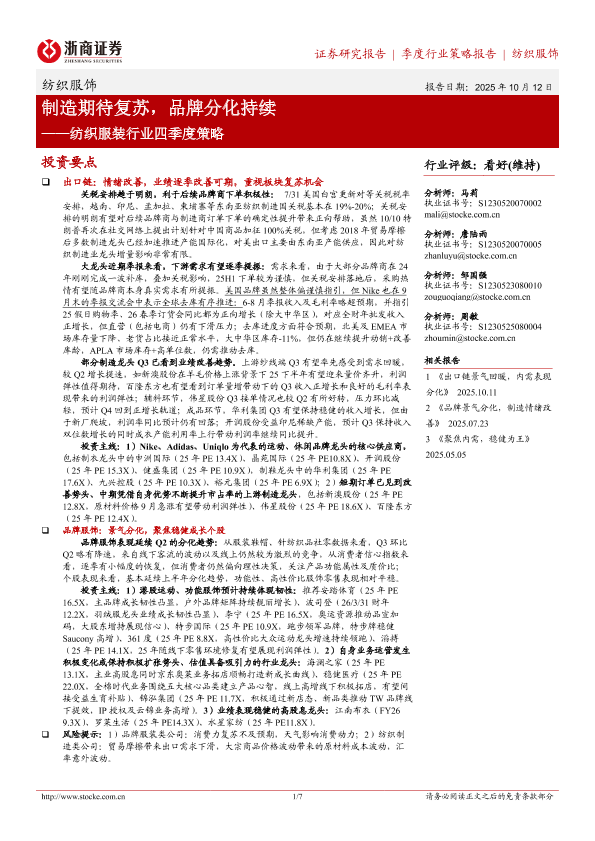 【浙商证券】【202510】制造期待复苏,品牌分化持续——纺织服装行业四季度策略-7页